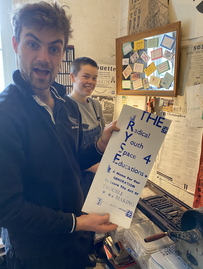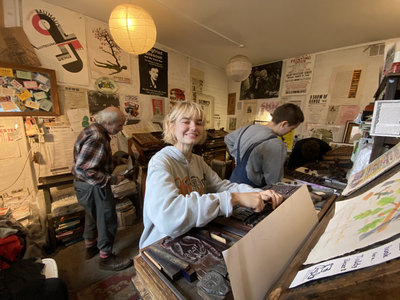 A group of us spent the afternoon with Dennis Gould, Stroud's legendary poet and letter press printmaker. He showed us how to make posters using his block print signature style. He has loads of draws of very old letters, numbers and images in all fonts, shapes and sizes, including a hand-carved pointing finger made in the eighteenth century! We had to pack all the blocks into the 'galley' (the tray which holds the letters) upside down, going right to left and pad the worn down letters with little bits of cardboard to makes sure they printed properly. The whole thing is held together with 'furniture'- little blocks of wood so that nothing wobbles when you roll the ink on. We made a first print of a poster for the RYSE and Clary made a poster for the new band she's going to form. We'll be back next week to make lots of prints, so if you're in Stroud look out for it around the place :)